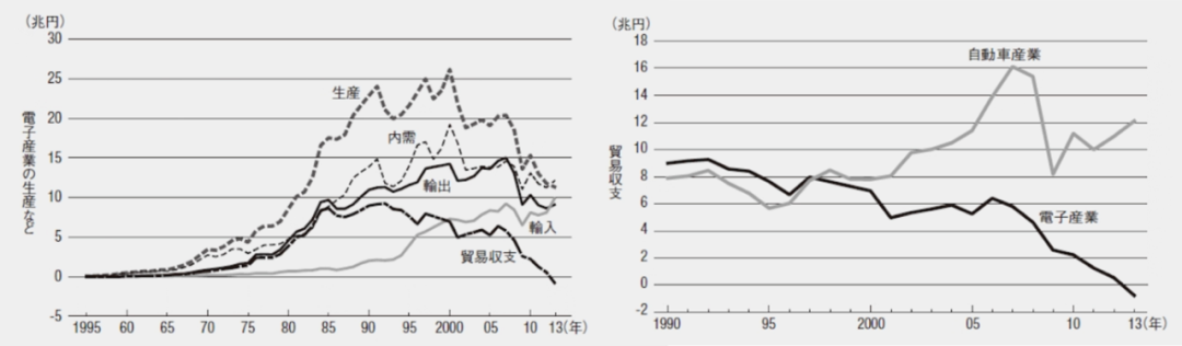 电子产品“出口创汇”时代的终结使得日本电子产业主要依靠内需拉动。1985年至2000年间,尽管整体增速大幅减缓,但是日本电子产业国内需求翻了一番。时至世纪之交,该产业生产额触及26万亿日元历史峰值。2000年后,电子产业急转直下,产值于2013年萎缩至11万亿日元——不及2000年峰值的一半,贸易差额由正转逆。