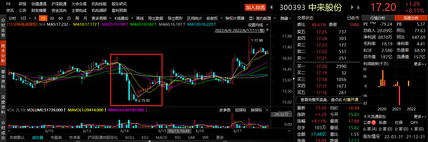 但受“光伏行业需求逐季增长”消息影响,近几日,A股光伏概念股都在持续走强。因此,在经历短暂小幅波动之后,公司股价近几日便持续上涨,截至17日,中来股份收盘价为17.20元,最新市值为187亿。