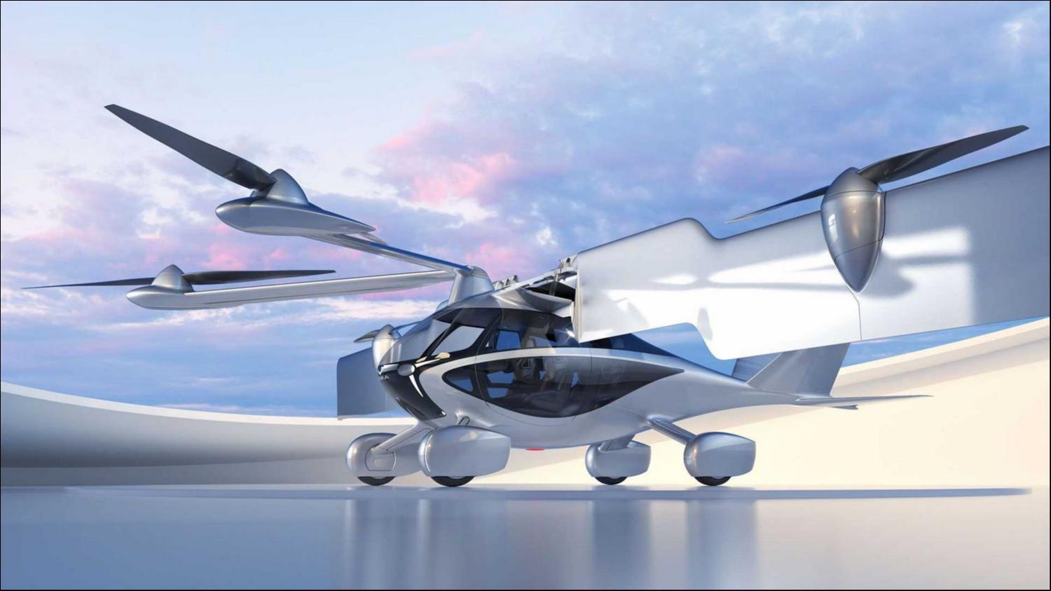 这是一款eVTOL(可垂直起降)飞行汽车,也就是说,它可以在任何直升飞机能到达的地方完成起降。当在陆地上时,机翼收缩起来使它的尺寸相当于一款SUV车型,使它可以在公路上行驶。