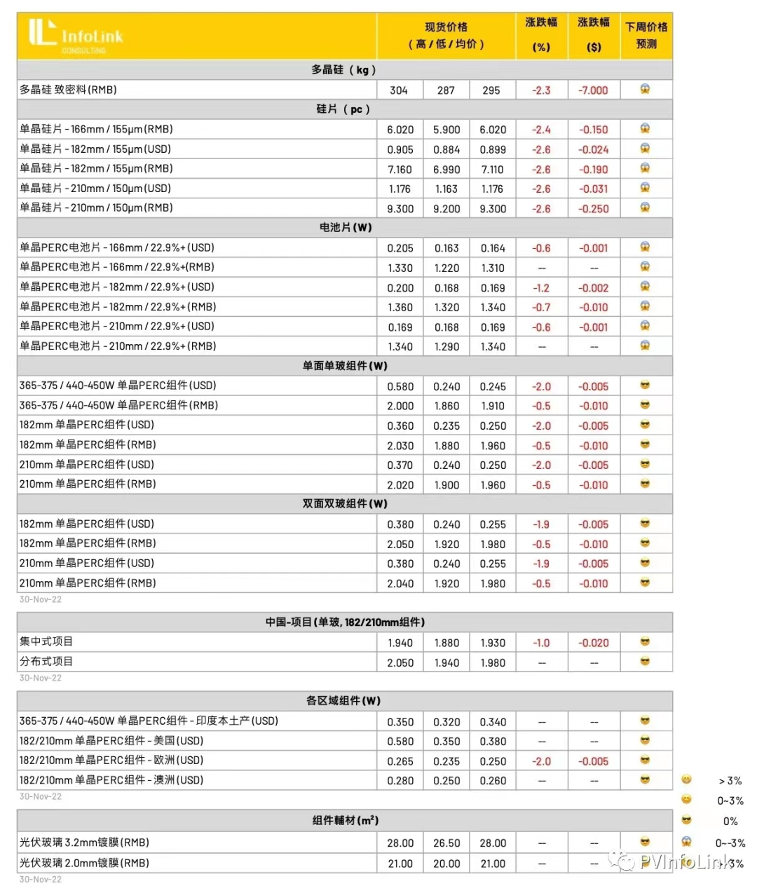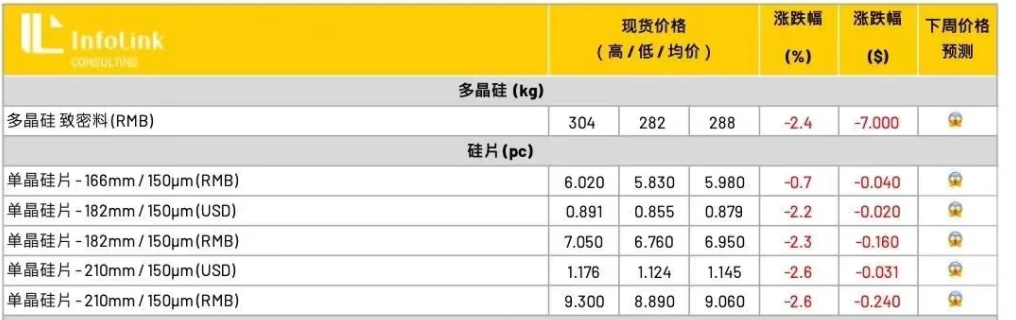 随后,11月24日,隆基绿能(601012.SH)也调整了单晶硅片价格,单晶硅片P型M10155μm厚度(182/247mm)的价格由7.54元下调至7.42元。