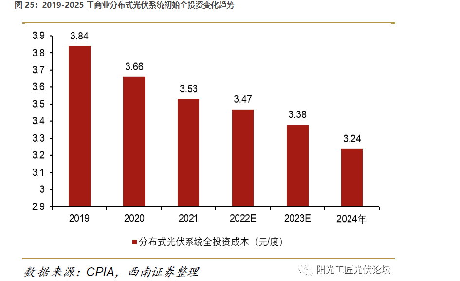 据中信建投测算,集中式光伏成本大概为4.17元/W,而户用分布式光伏的成本仅为3.19元/W。众所周知,光伏建设,动则MV、GW(1GW=1000MW=10001000KW=10001000*1000W)级别,对价格变动极其敏感,几分钱的成本差距对利润影响巨大,更何况接近1元的价差。