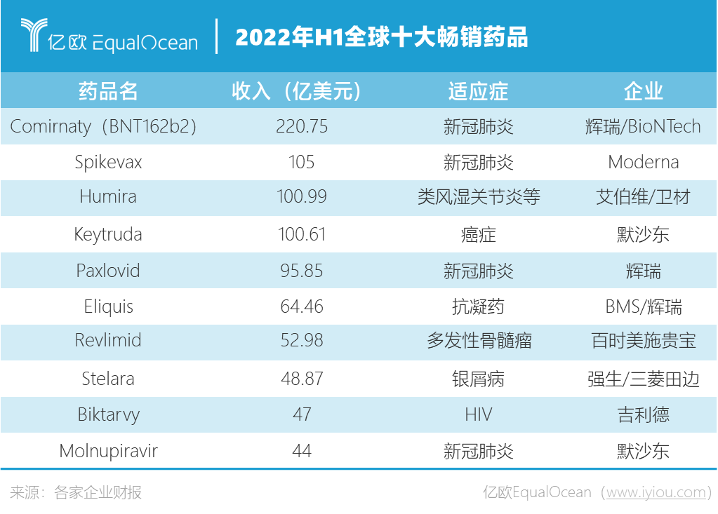毫无疑问,轻松越过者,都有重磅炸弹傍身。除了业绩长青的修美乐和新晋的百亿玩家K药,疫情这架“造富机”在第三个年头依旧没有停止运转,全球十大药品里有四款新冠疫苗/口服药,已占据半壁江山。它们的存在,不仅让辉瑞继续冲破营收天花板,也让拥有新冠口服药和PD-1抑制剂Keytruda的默沙东在半年里前进6个名次,挤下强生稳居第二。