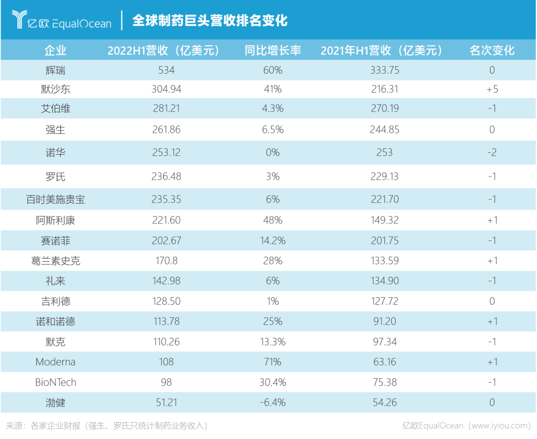 因为新冠业务和其他药品的销售变化,同比2021年上半年,全球制药巨头的营收榜单名次也再度有所更迭。