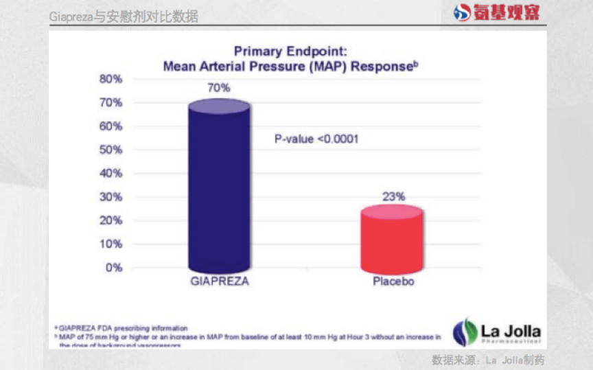 其次,Giapreza缺乏硬核临床数据。虽然在血管加压方面,Giapreza表现出极为不错的治疗效果。如下图所示,其三期临床数据的结论是,Giapreza明显改善了血压反应。