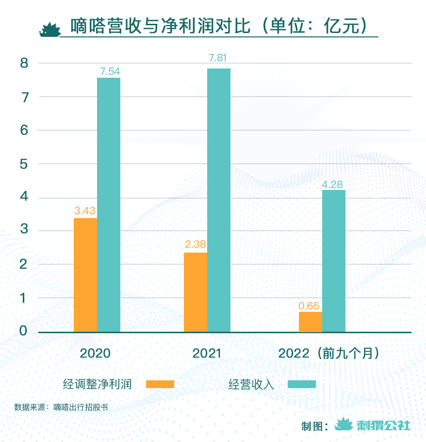至于滴滴,其近年财报披露的经营毛利率在10%上下。受制于此,滴滴一直处于整体亏损的状态,其中2020年约为100亿元、2021年则高达500亿。而嘀嗒已经悄悄整体盈利了:2020年、2021年及2022年前9个月,嘀嗒出行调整后净利润分别为3.43亿元、2.38亿元和0.65亿元。从2019年首次盈利开始,嘀嗒已经连续4年盈利了。