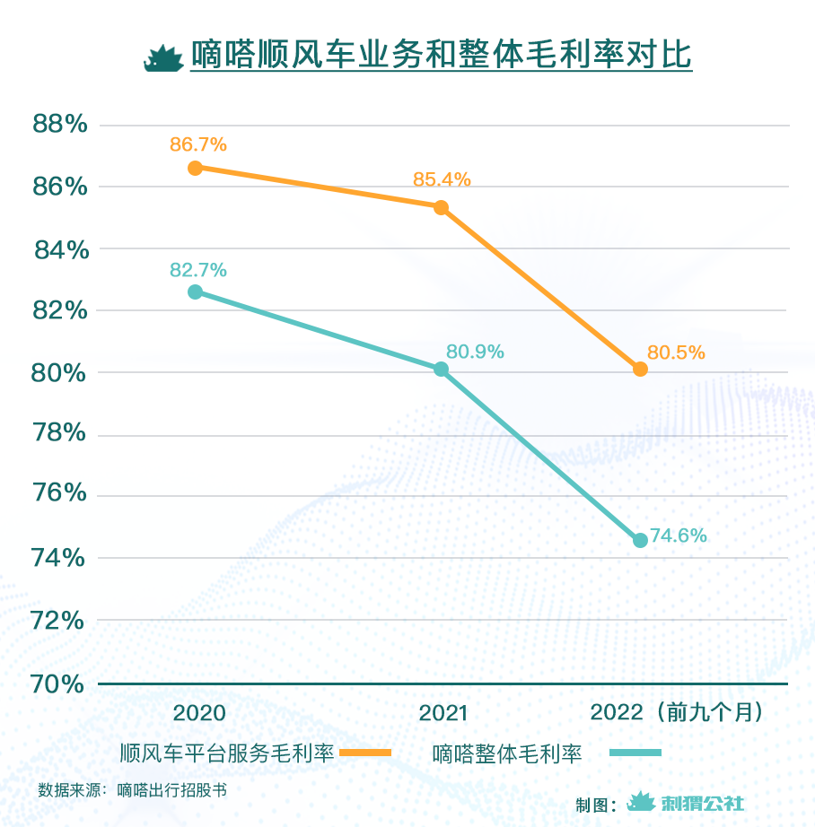 顺风车业务的毛利率连年持续在80%以上:2020年、2021年和2022年的前9个月,毛利率分别是86.7%、85.4%和80.5%。