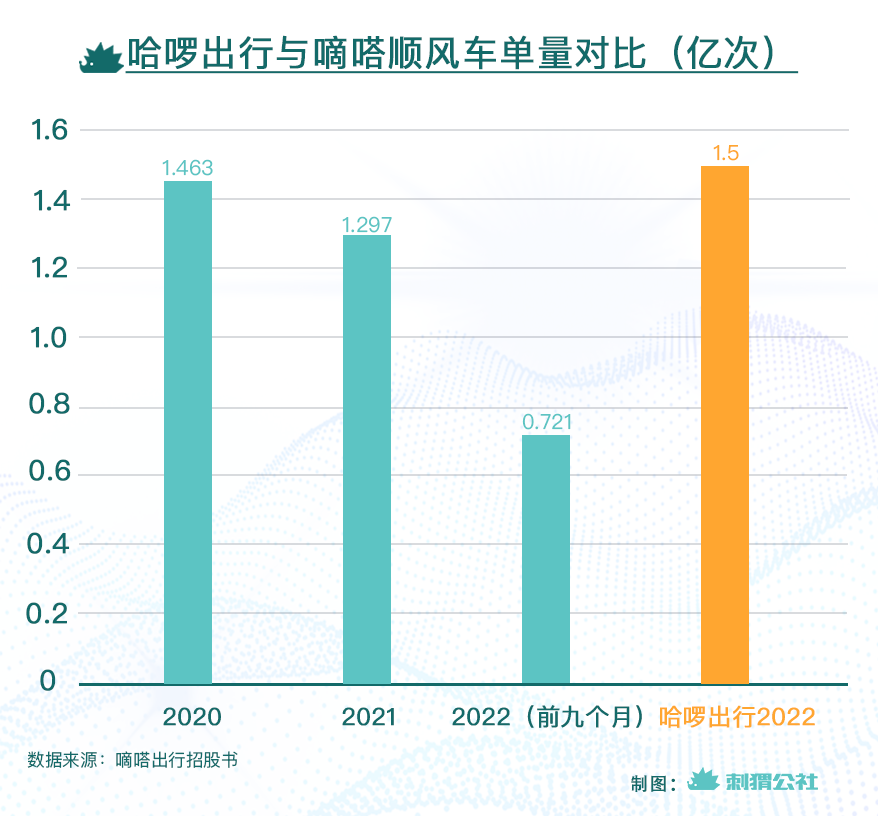 从嘀嗒的核心业务顺风车上看,业绩报告期内(2020年、2021年和2022年前9个月,下同),嘀嗒顺风车分别产生1.463亿次、1.297亿次和0.721亿次搭乘;后起之秀哈啰顺风车的订单,在2022年达到了1.5亿次;