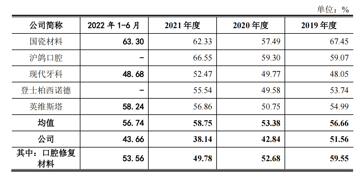 再看毛利率,与行业平均值也有不小的差距,甚至毛利率最高的口腔修复材料近几年也在同行中也表现并不出众。