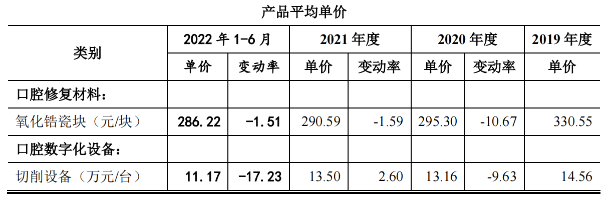 没有先发优势的爱迪特在市场竞争中不得不牺牲利润保持增长。2019 年至2022上半年,公司氧化锆瓷块分别实现收入 2.17亿元、2.24亿元、2.71亿元和1.51亿元,占主营业务收入比例分别为 72.80%、61.92%、49.72%和 56.04%。虽然销量和销售额增长,但却是建立在产品售价持续下降的基础上。报告期内公司氧化锆瓷块的平均销售单价分别为330.55元/块、295.30元/块、290.30元/块和286.22元/块,降价幅度为13.41%。