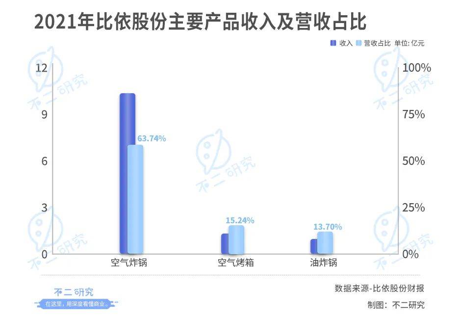 据比依股份年报显示,比依股份主要产品包括空气炸锅、空气烤箱、油炸锅,三者所产生收入分别占其营收比例为63.74%,15.24%,13.70%。