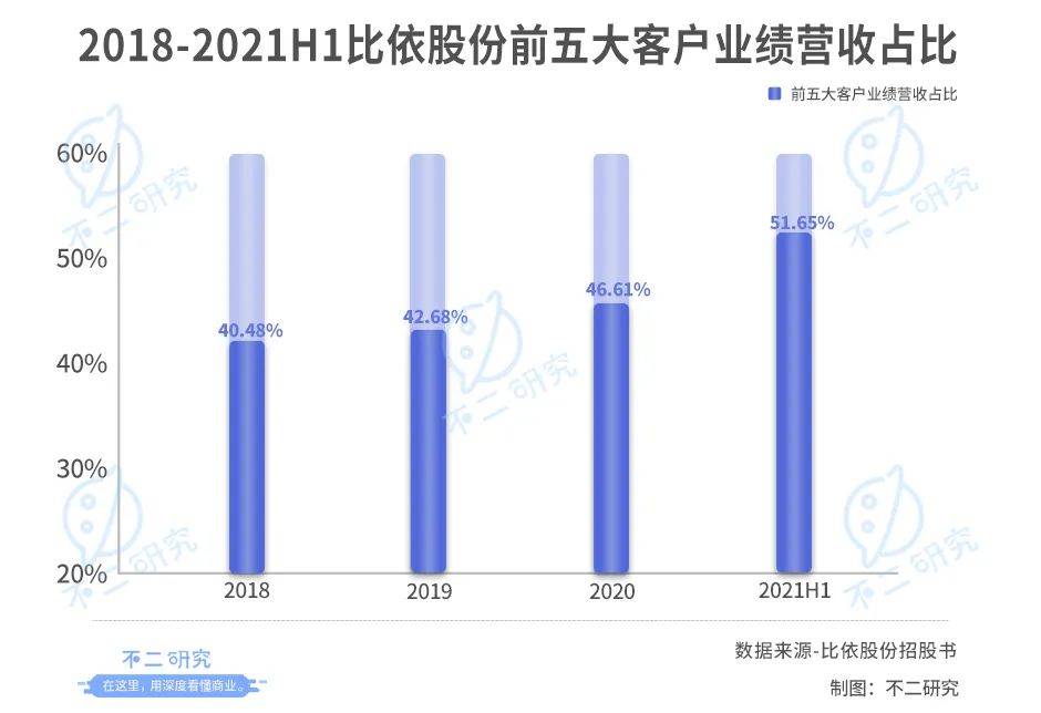 其次,以代工出口为主的模式也意味着比依股份容易存在大客户依赖的情况,据比依股份招股书显示,2018-2021H1,比依股份前五大客户业绩占其营收比例分别为40.48%,42.68%,46.61%,51.65%。