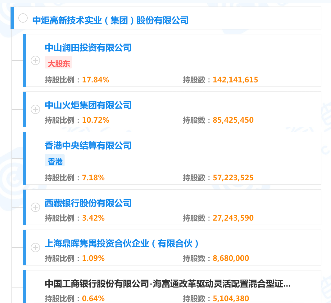 此外,中炬高新还接到持股5%以上股东火炬集团的一致行动人鼎晖寰盈的通知,鼎晖寰盈于当日通过大宗交易方式增持了中炬高新,占比1.09%。紧随鼎晖寰盈的增持完成后,火炬集团、鼎晖寰盈与国泰君安 QFII-CC一致行动人合计持有中炬高新比例升至12.31%。
