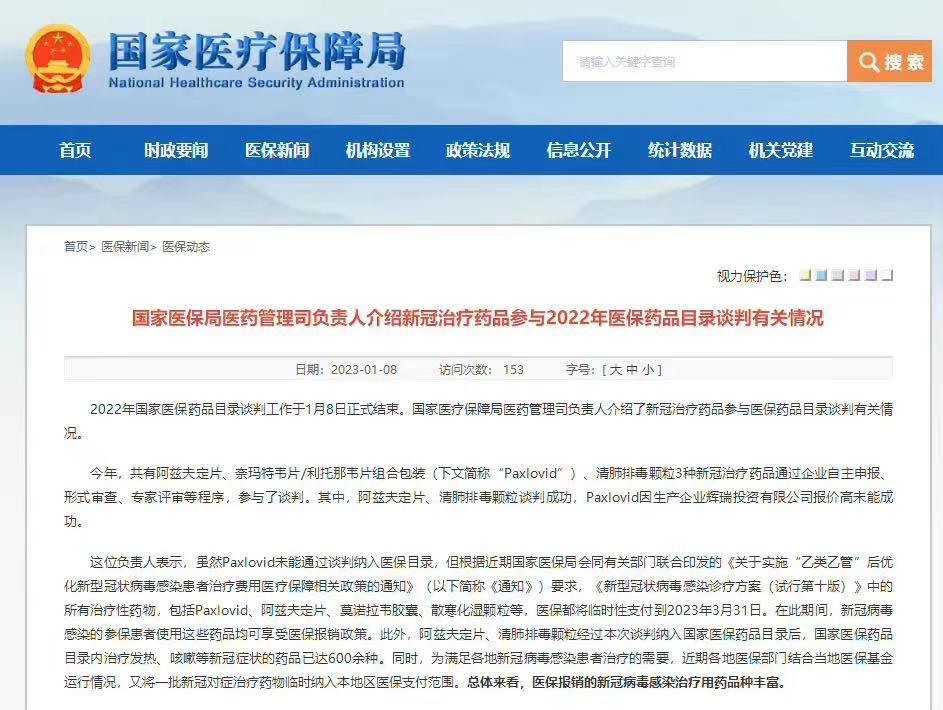 国家医保局医药管理司负责人对新冠治疗药物谈判情况进行回应:虽然Paxlovid未能通过谈判纳入医保目录,但根据近期国家医保局会同有关部门联合印发的《关于实施“乙类乙管”后优化新型冠状病毒感染患者治疗费用医疗保障相关政策的通知》要求,《新型冠状病毒感染诊疗方案(试行第十版)》中的所有治疗性药物,包括Paxlovid、阿兹夫定片、莫诺拉韦胶囊、散寒化湿颗粒等,医保都将临时性支付到2023年3月31日。在此期间,新冠病毒感染的参保患者使用这些药品均可享受医保报销政策。