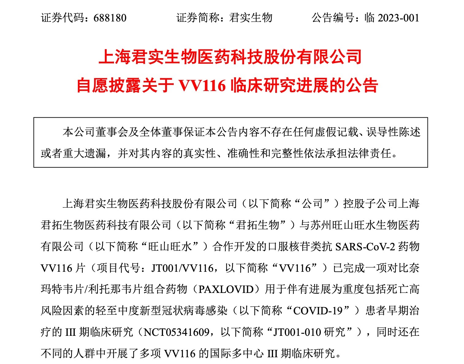 1月3日晚间,君实生物发布公告表示,公司控股子公司君拓生物与旺山旺水合作开发的口服核苷类抗SARS-CoV-2药物VV116片(简称“VV116”)已完成一项对比奈玛特韦片/利托那韦片组合药物(PAXLOVID)用于伴有进展为重度包括死亡高风险因素的轻至中度新型冠状病毒感染患者早期治疗的III期临床研究,同时还在不同的人群中开展了多项VV116的国际多中心III期临床研究;信立泰也发布公告称,国家药监局核准签发《临床试验批准通知书》,同意SAL0133片开展治疗成人轻型/普通型新型冠状病毒肺炎(COVID-19)适应症Ⅰ期临床试验。