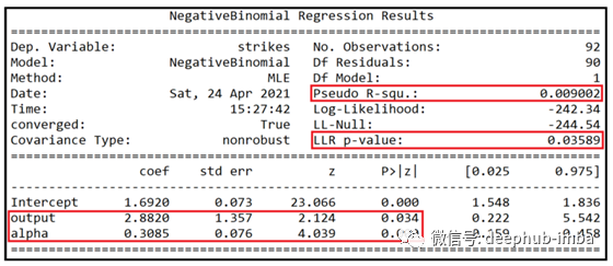 如系数的p值(0.034和0.000)所示,输出和色散参数alpha在95%置信度上都具有统计学意义。