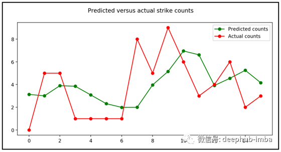 让我们使用拟合的滞后变量Poisson模型来预测我们先前预留的测试数据集的罢工次数。我们不应该寄希望于预测的质量过高。请记住,尽管此模型比以前的NB2模型拟合得好得多,但伪R平方仍然仅为16%。