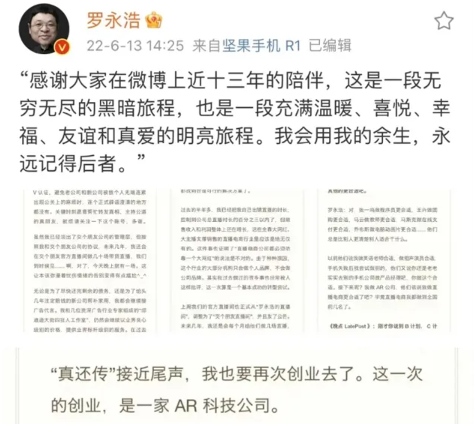 2022年6月13日,罗永浩在微博发文称:“‘真还传’接近尾声,我也要再次创业去了。这一次的创业,是一家AR科技公司”。随后,罗永浩正式“退网”,拥有1775万粉丝的“罗永浩”微博账号更名为“交个朋友直播间”。