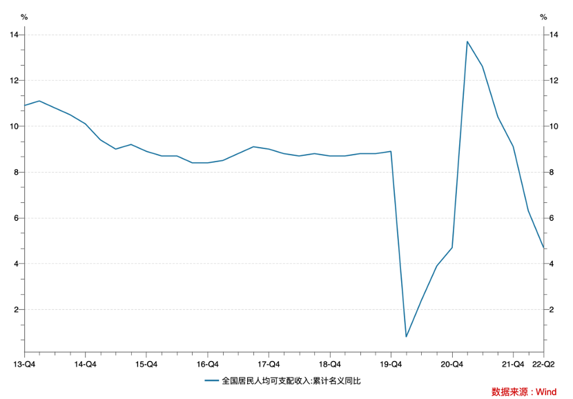 我们来看全国居民人民可支配收入(累计名义同比增长)的情况,见下图