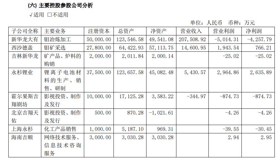 随着吉翔股份中报出炉,钛媒体APP注意到,永杉锂业易主半年来基本面有了较大改善:实现营收5430万元,净利润2635万元,总资产12.36亿元,净资产4.5亿元,资产负债率63.59%,成为吉翔股份一众亏损子公司中的盈利主力,虽然规模较小,利润率已远超钼业业务。