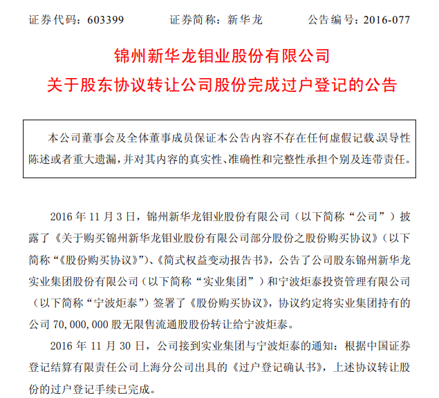 2015年,钼市场全年动荡,新华龙巨亏3.52亿元,第二年,郭光华深陷贿选丑闻与债务重压,新华龙先后两次将股权受让给杉杉控股旗下宁波炬泰通:当年年底,新华龙向宁波炬泰转让总股本的14.02%,2017年2月宁波炬泰再次受让新华龙14.68%股权,合计耗资16.05亿元,成为新的控股股东及实际控制人。