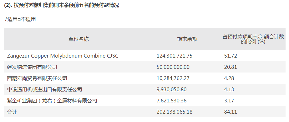 或出于降本增效考虑,半年报预付款披露显示,吉翔股份今年开始向亚美尼亚Zangezur铜钼矿大量购进矿石,公司预付款由此同比暴增70.63%。
