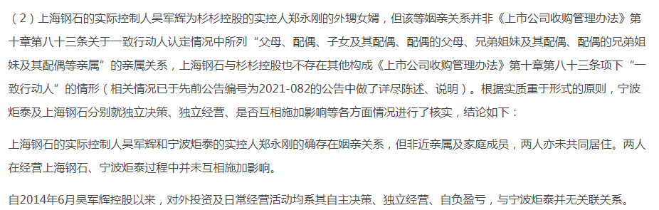 面对质疑,吉翔股份在回复监管函时承认,上海钢石实控人吴军辉的配偶吴海霞,为杉杉控股实控人郑永刚的外甥女,但吉翔股份认为,外甥女婿与舅舅并非《上市公司收购管理办法》认定的亲属关系。