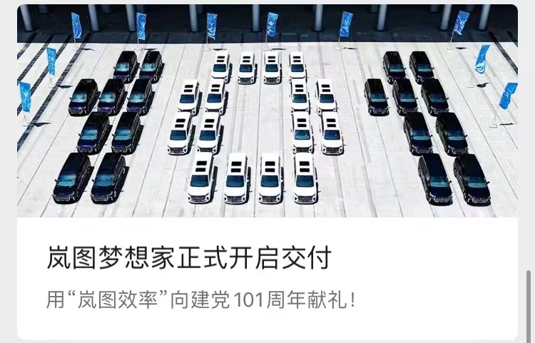 7月岚图梦想家央企、国企、大客户采购签约仪式在武汉举办,据报道共有97家央企、国企签约了6000辆岚图梦想家订单。几天后,岚图又向芒果TV交付12台梦想家作为节目录制专用车。