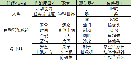 这也被称为AI Agent的PEAS模型。我们给大家简单做个表,感受一下: