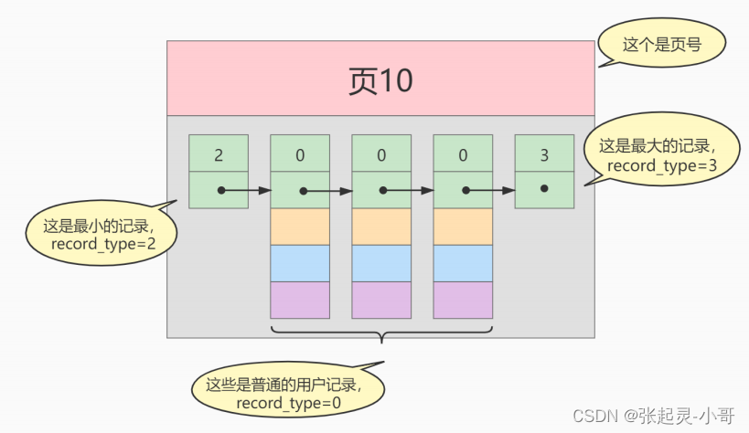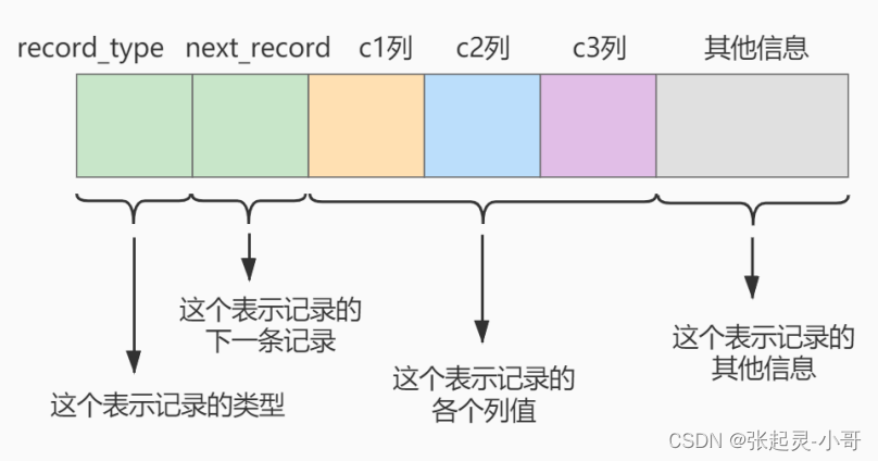 next_record :记录头信息的一项属性,表示下一条地址相对于本条记录的地址偏移量,我们用箭头来表明下一条记录是谁。