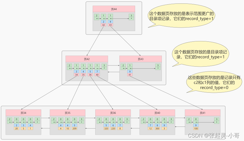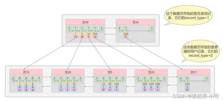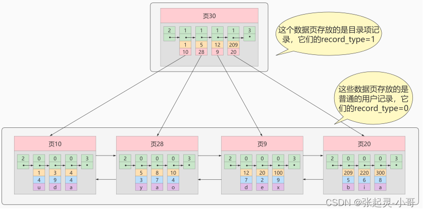从图中可以看出来,我们新分配了一个编号为30的页来专门存储目录项记录。这里再次强调 目录项记录 和普通的 用户记录 的不同点: