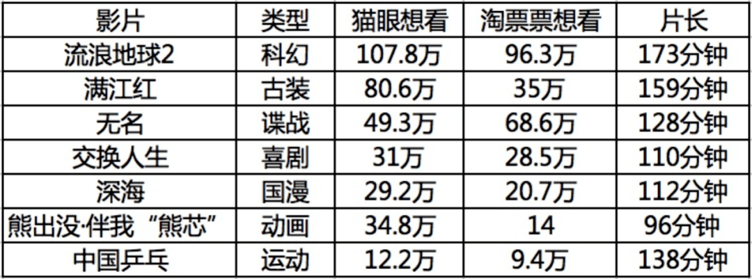 拿热度最高的《流浪地球2》来说,目前猫眼、淘票票两大平台累计想看人数为200万出头,这个热度虽然已经是非常出众,也是当之无愧的春节档冠军,但横向对比之下,在历史榜单上根本排不上号。这意味着大年初一的单片“爆破”能力是不如往年的。