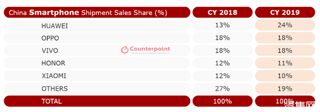 根据市场调研机构Counterpoint Research统计的2019年中国手机市场份额排名报告显示,单独统计的荣耀以11%的份额力压小米,排在华为、OPPO、vivo之后,位列第四,这也成为了荣耀的高光时刻。