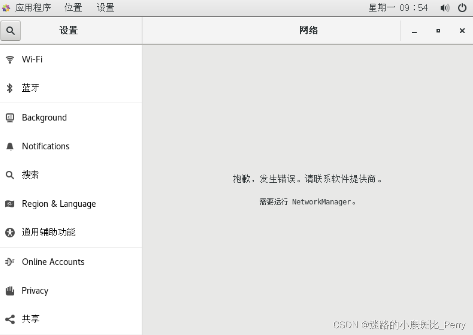 问题1:通过 应用程序->系统工具->设置->网络 进行网络配置时显示“抱歉,发生错误。请联系软件提供商。”
