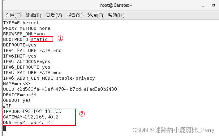 1、在root权限下 输入vim /etc/sysconfig/network-scripts/ifcfg-ens33命令。