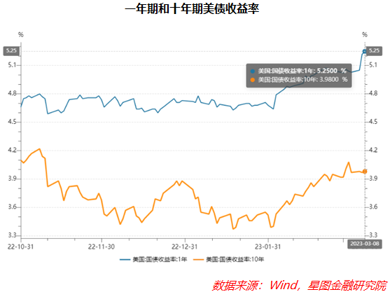 从近期市场调整的原因来看,无外乎两个主要原因。一方面是今年经济增长5%的目标落在了市场预期的最低点,以及赤字率3%的安排、专项债3.8万亿都均低于市场此前偏高的预期,指数的回落一定程度上是对前期偏高预期的调整。另一方面是海外市场频传的鹰派发言,近期美联储主席鲍威尔在参议院听证会就半年度货币政策报告发表演讲时,又再次重申了“美联储可能不仅会加快加息步伐,终端利率也可能高于此前预期”,截止2023你那3月8日,美国一年期国债收益率和十年期国债收益率分别涨至5.25%和3.98%。