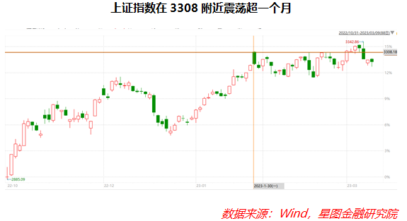 从年初至今,市场一直在博弈是上半年经济的修复,乐观者预期上半年经济的修复,悲观者预期经济只能实现一季度的短期脉冲,二季度无法更强。1月份的金融、经济数据虽然让市场兴奋,但也认识到了现实。1月CPI同比上升2.1%,但PPI同比下降0.8%,环比下降0.4%。1月信贷新增4.9万亿元创新高,但居民中长期贷款同比少增约5200亿,居民存款同比多增3万多亿。超预期的经济、金融数据让市场保持了谨慎的乐观,上证指数在纠结的情绪中多次进攻3308点(1月30日的最高点),近期在热炒“中特估值”概念下,虽然上证成功突破前高,但好景并不长久,两会政府工作报告对2023年经济增长目标5%的确定,再次让市场重估上半年经济的可实现性,强预期全面转向弱预期,上证指数四连阴,且重新回落到3300点之下。