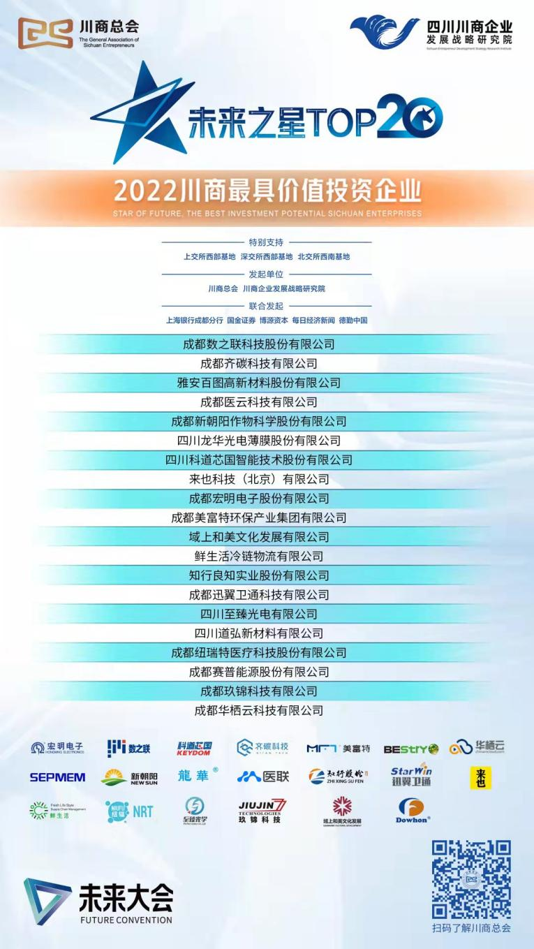 据悉,“未来之星TOP20榜单”评选,是川商总会、川商企业发展战略研究院发起的聚榜单焦高成长性科创企业健康快速发展的公益计划。“2022未来之星TOP20榜单”评选自3月启动征集以来,报名企业超过 1000 家,328家企业入围参选,通过参选企业在赛道优势、韧性增长、价值发现、硬核能力、数智赋能、前景可期七大维度,初评入围100家企业,复评入围60家企业,二次复评30家企业,现场综合复核评出未来之星TOP20榜单。据统计,2021年TOP20榜单的20家企业已经有2家成功上市、1家上市申请被受理,一年来累计融资70多亿元,企业估值平均增长1倍以上。