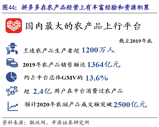 拼多多做农业主要基于两个方向,其一是基于大数据、云计算和分布式人工智能的技术,打造“农地云拼”的模式,将分散的农业产能和分散的农产品需求在云端拼在一起,带动农产品大规模上行。