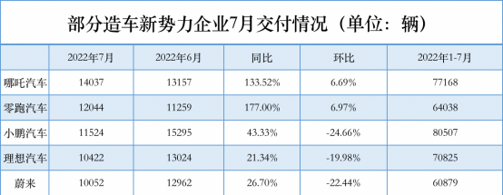 以月交过万这一主流标准为参照,零跑汽车自三月开始便一直处在这一水平线之上。今年1-7月累计交付6.4万辆。哪吒表现更为突出,1-7月则累计共交付7.72万辆。此外,问界也已经连续三个月保持着月销过万。