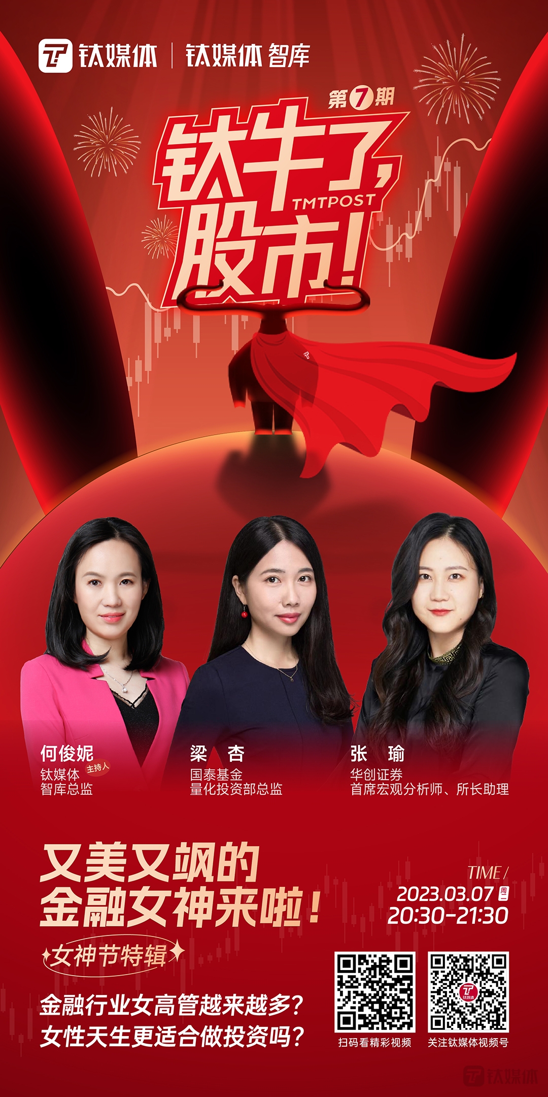 金融圈作为“内卷之王”,一直是顶尖名校毕业生扎堆之地,“名校硕博研究生+高含金量资格证书+对口实习经验”成为入行标配。近年来,越来越多女性开始迈进这一高门槛行业,追求自身的职业理想。巴菲特曾说过,女性天生是很好的投资者,如今,在中国资本市场,越来越多的女基金经理和女分析师乘风破浪,犹如一朵朵铿锵玫瑰,向阳而生、栉风沐雨、尽情绽放,为投资者持续创造收益,为金融市场的发展贡献力量。在金融投资领域女性是否具备天然优势?女性投资人的思维习惯和投资逻辑又有哪些不同?钛媒体《钛牛了,股市!》主理人何俊妮将邀请国泰基金量化投资部总监梁杏、华创证券首席宏观分析师、所长助理张瑜,一起走进“金融女神的投资与人生”。
