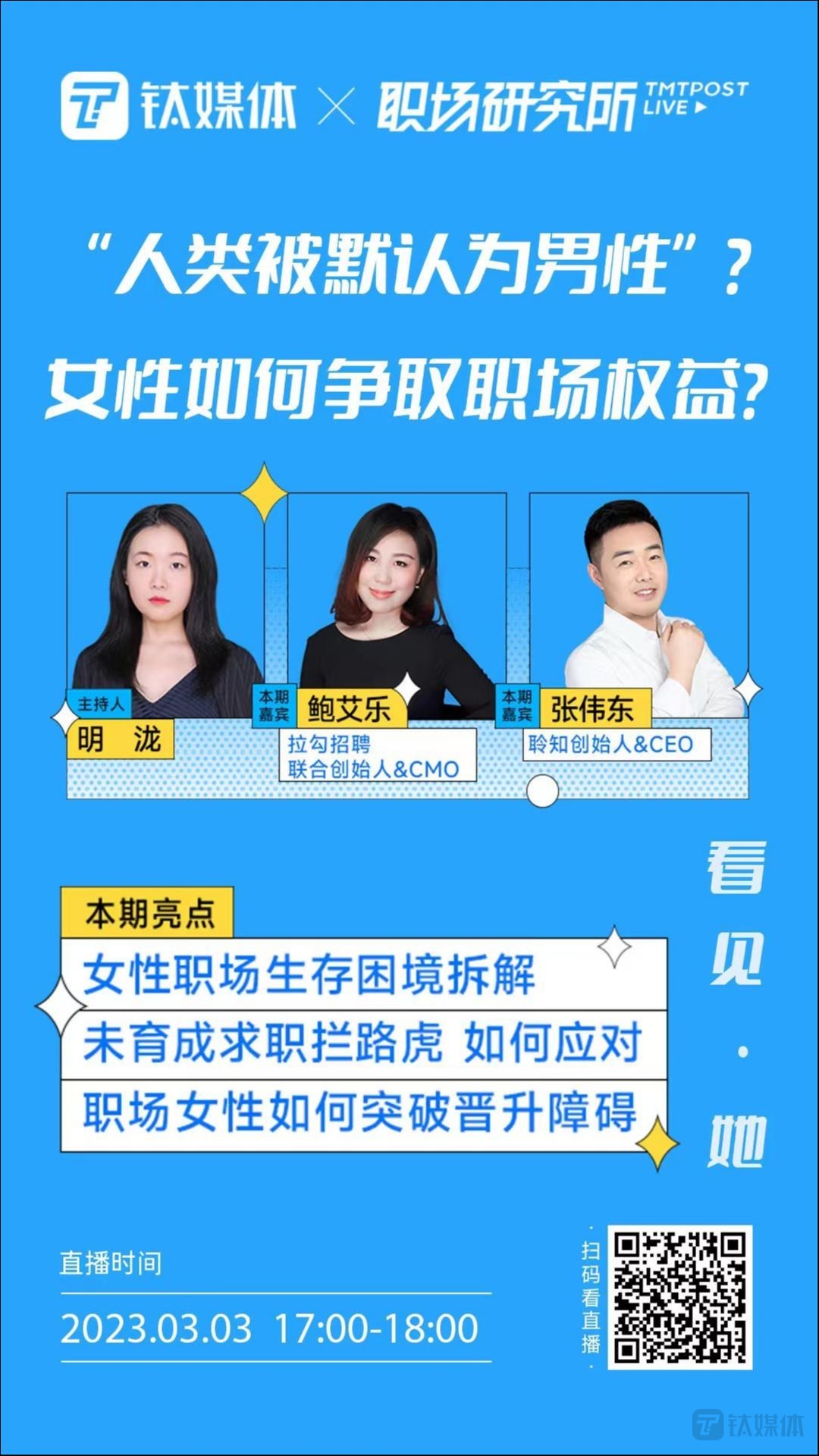 《职场研究所》是钛媒体一档关注职业规划和职场发展的对话节目,节目主理人明泷也是一位职场女性,在过往对各种职业进行调研以及跟职场女性进行对话的过程中,明泷发现职场上依旧存在种种对女性的隐形偏见,也有不少职场女性在应对这些偏见时会显得无措和无力,为此,明泷特邀请到了拉勾招聘联合创始人&CMO鲍艾乐Ella Bao、聆知创始人&CEO张伟东带来直播对话《看见·她|“人类被默认为男性”?女性如何争取职场权益?》,共同拆解女性职场困境、分享打破女性职场升迁天花板的“经验之谈”。