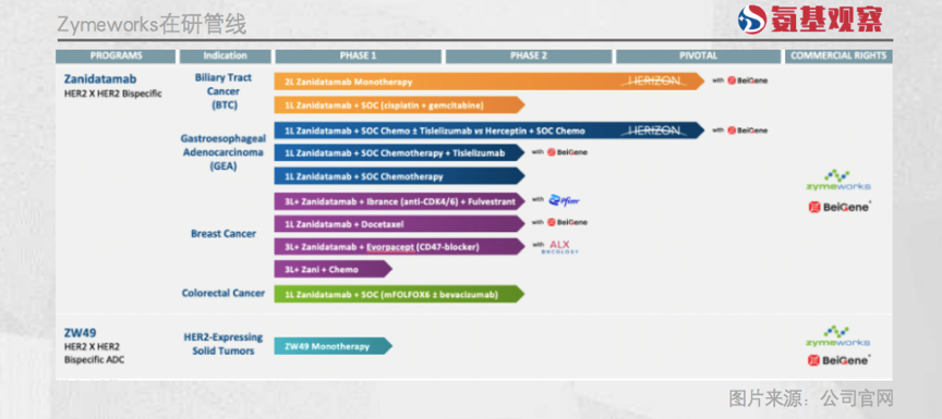 Zymeworks最核心的产品是ZW25(Zanidatamab)和ZW49。Zanidatamab是一款通过Azymetric平台研发的新型靶向HER2双抗,可以同时靶向HER2胞外区域的亚基2和亚基4的两个不同表位,有可能带来更好的治疗效果。