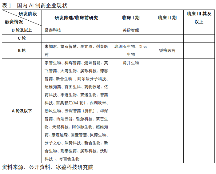 在国外AI制药企业临床试验一年之后,国内AI制药企业开始宣布基于AI设计的药物获得中国国家药品监督管理局药品审评中心临床试验默示许可,进入临床阶段。但是,能够进入临床阶段的AI制药企业并不多见,依然只有英矽智能、冰洲石生物、红云生物、角井生物、锐格医药等几家企业,部分进入临床阶段的药物是否全流程基于AI设计还存在争议,绝大多数AI制药企业还集中在临床前研究阶段。