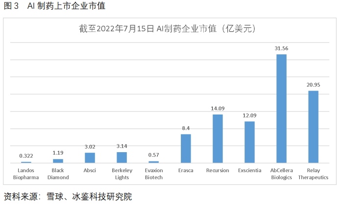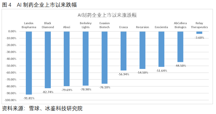 AI制药虽经历十年的发展,依然没有药物获批上市,这也导致该行业质疑声不断增加,特别是欧美。自2021年下半年开始,中美AI制药企业开始出现不同走势,呈现出冰火两重天。部分投资人也因此套现走人,导致AI制药企业股价惨跌。据冰鉴科技研究院统计,部分美国上市AI制药药企市值已经低于1亿美元,跌幅超过90%。Exscientia上市首日收盘市值高达32亿美元,2022年7月15日,仅12亿美元,跌幅超过一半。