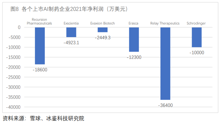 此外,2021年Recursion Pharmaceuticals营业收入同比增长156%,净利润同比负增长115%,净亏损1.86亿美元,2022年1季度净亏损5597万美元,同比负增长82%。其他AI制药公司2021财年也出现大幅度亏损,如下图。