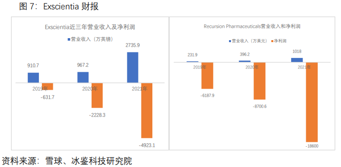 一些AI制药企业因此成功上市。但是,AI制药行业依然亏损严重,甚至没有止血迹象。如Exscientia,虽然近三年营业收入保持高速增长,2021年Exscientia营业收入同比增加近300%,但是,净亏损也不断扩大,亏损从2019年的631万美元增加到2021年4923万美元。