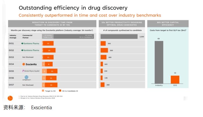 根据Exscientia官网披露材料,使用Exscientia平台进行药物发现平均仅需要12个月,远低于行业平均54个月,相当于时间缩短了70%;最佳候选药物设计生产力提高了十倍,平均研发投入1200万美元,而行业平均水平需要6300万美元,资本效率提高了80%。