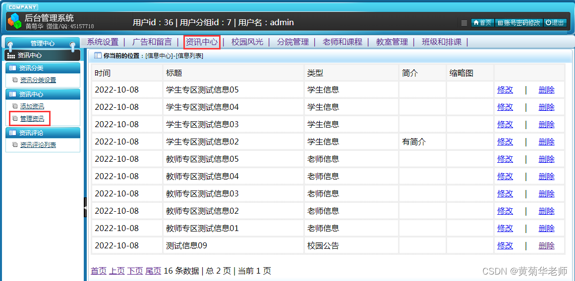 管理资讯:查看已录入资讯列表,支持删除和修改