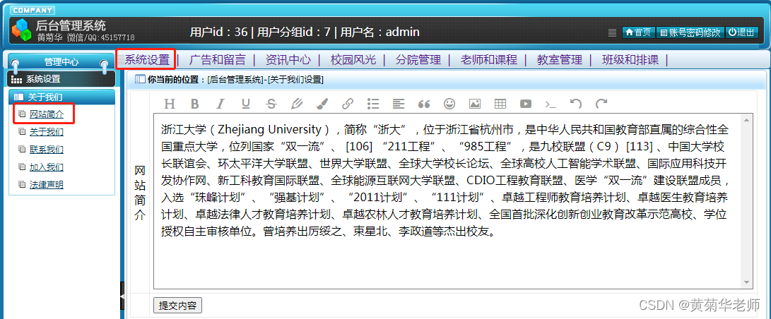 关于我们设置:设置学校简介、联系我们、加入我们、法律声明、学校详情