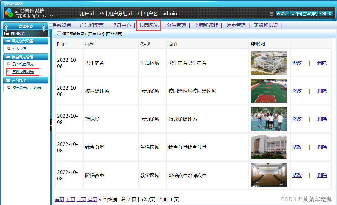 管理校园风光:查看已录入校园风光列表,支持删除和修改